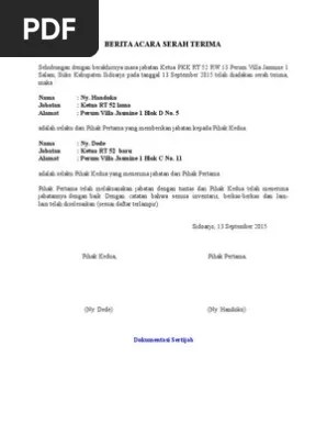 Demikianlah berita acara serah terima barang ini diadakan oleh masing masing belah pihak adapun barang barang tersebut dalam kondisi normal dan baik semenjak penandatanganan berita acara ini dengan begitu barang tersebut sudah menjadi tanggung jawab pihak kedua memelihara merawat dengan baik dan dipakai untuk kebutuhan tempat dimana barang itu dibutuhkan. Namun biasanya surat serah terima dipergunakan ketika pengiriman barang atau dokumen sebagai bukti bahwa barang yang telah dikirim tersebut sudah diterima. 3 surat serah terima pekerjaan instansi pemerintah surat pernyataan orang tua.