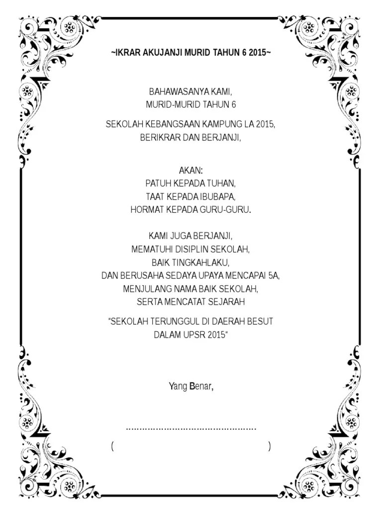 Contoh Surat Aku Janji Murid Tahun 6 - Bergema suara kamu di dewan tadi sungguh bersemangat ada riak sebak di wajah ibubapa kamu dengan lafaznya aku janji tadi maka kamu sudah terikat dengan satu kontrak yang perlu dipenuhi. 23 februari 2017 khamis masa. 45 61orang waris murid tahun 6. 11 10 pagi hingga1 40 petang tempat.
