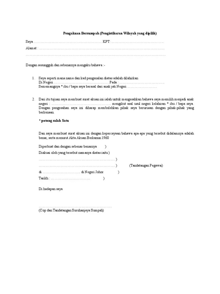 Contoh surat akuan sumpah wilayah asal - Diperbuat dan dengan sebenar benarnya diakui oleh yang tersebut namanya di atas iaitu. Dokumen sokongan yang perlu dikemukakan kepada pihak pemaju adalah seperti di bawah. Surat rasmi akuan bujang majikan surat rasmi akuan bujang dari contoh surat rasmi akuan surat rasmi akuan pendapatan surat rasmi akuan b.