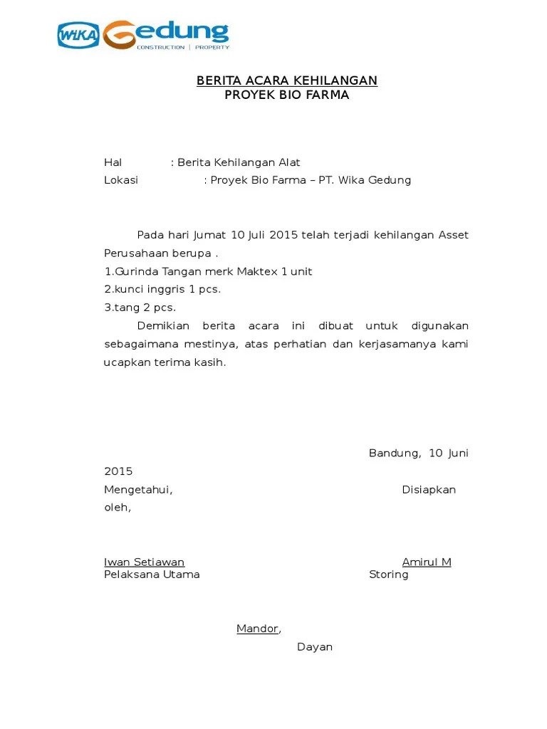 Contoh surat berita acara kehilangan barang perusahaan - Haryati murni jabatan. Surat berita acara kehilangan ini dibuat pada hari ini kamis 16 april 2020 bertempat di suka maju oleh saya. Demikianlah contoh berita acara kehilangan barang.