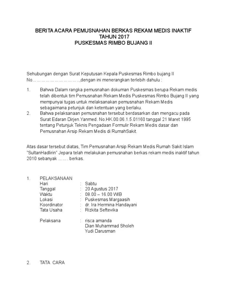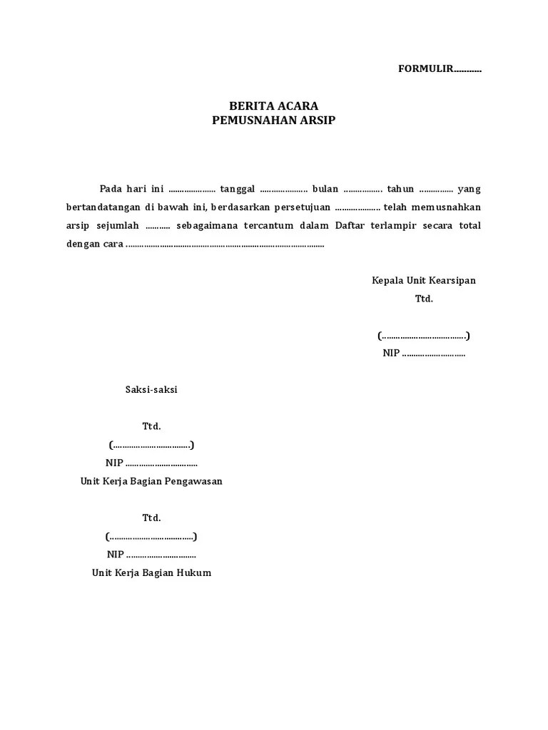 Bagi anda yang saat ini mau melakukan aktivitas di dunia bisnis tidak salahnya jika anda membaca artikel yang akan kami bahas dikesempatan ini. Berdasarkan surat edaran kepala arsip nasional nomor se 01 1981 pemusnahan arsip harus dilakukan dengan disertai daftar pertelaan arsip yang ingin dimusnahkan serta berita acara pemusnahan arsip yang kemudian ditandatangani oleh penanggungjawab pemusnahan bersama saksi saksi 2 orang. It2 18 tu 01 05 2015 pada hari kamis tanggal 07 bulan mei tahun 2015 yang bertanda tangan di bawah ini tim pemusnahan arsip upt kearsipan berdasarkan peraturan pemerintah nomor 34 tahun 1979 tentang pemusnahan arsip uu nomor 43 tahun 2009 tentang kearsipan dan jadwal retensi.