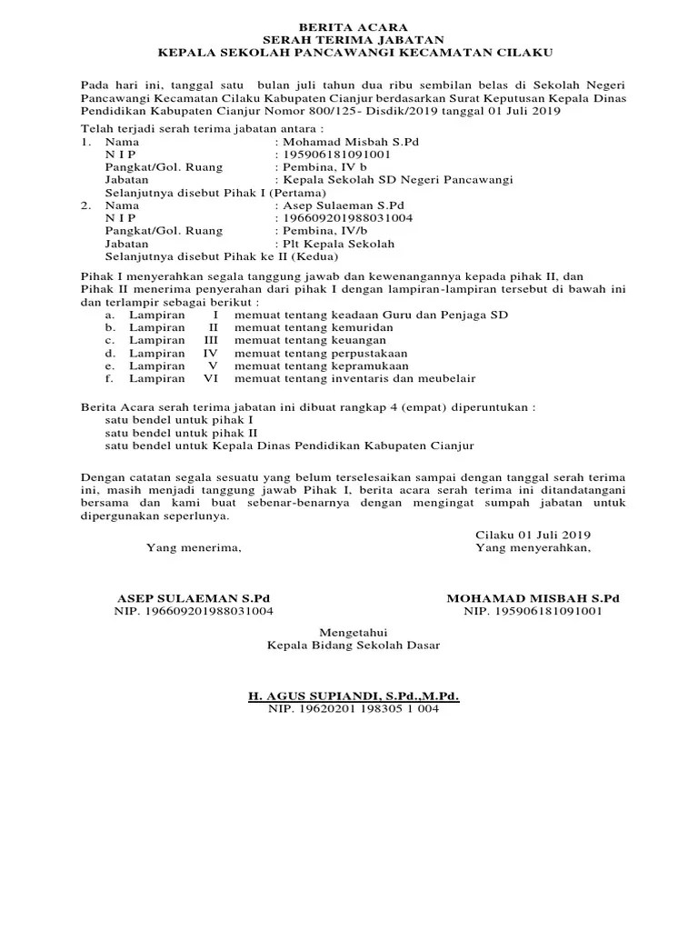 Contoh Surat Berita Acara Serah Terima Jabatan Kepala Sekolah Sd - Contoh surat berita acara serah terima jabatan kepala sekolah madrasah sahabat abdan pada pertemuan kali ini saya kembali akan membagikan contoh surat yaitu surat berita acara serah terima jabatan kepala sekolah atau madrasah. Demikianlah berita acara serah terima barang yang telah diadakan oleh kedua belah pihak dengan baik serta kondisi barang dalam kondisi baik serta jumlah yang tepat. Berdasarkan surat keputusan bupati nomor. Surat berita acara serah terima bisa dipergunakan untuk banyak hal. Sebagai salah satu contoh kecil kita bisa menggunakan surat berita acara serah terima barang dari pihak pembeli yang di tanda tangani bersama oleh kedua belah pihak yakni pihak penjual dan pihak pembeli. Berita acara serah terima kepala sekolah. Contoh Surat Berita Acara Serah Terima Jabatan Kepala Sekolah Sd Softgaleri adalah blog yang berbagi informasi modul pkb kepala sekolah sd smp sma smk adminitrasi kepala sekolah pendidikan kepala sekoalh aplikasi dan administrasi guru yang mana file berikut ini adalah kumpulan dari berbagi sumber tentang berita acara serah terima jabatan kepala sekolah sma yang bisa bapak ibu gunakan. Telah terjadi serah terima jabatan antara.