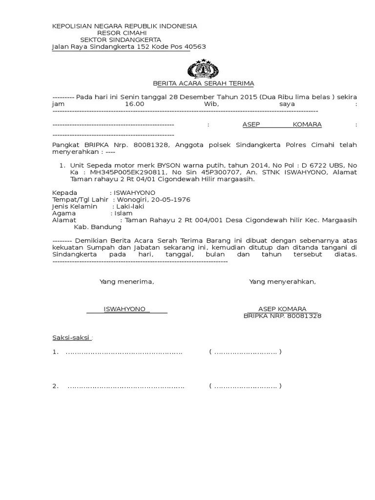 Dokumen ini umumnya berisi tentang jenis barang nama barang dan detail mengenai kerusakan tersebut. Berbagi ke twitter berbagi ke facebook bagikan ke pinterest. Atau sebagai dokumen resmi yang mana dapat digunakan untuk barang bukti terjadinya sutau pertemuan kejadian maupun transaksi tertentu.