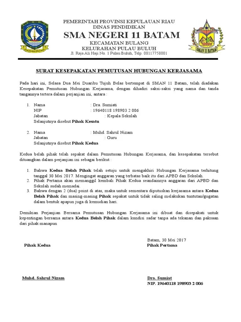 Contoh Surat Kesepakatan Bersama Pemutusan Hubungan Kerja - Draf kesepakatan bersama pengakhiran perjanjian ini berisi kesepakatan bersama diantara para pihak yang membuat dan menandatangani perjanjian kontrak untuk mengakhiri perjanjian diantar mereka sebelum berakhirnya jangka waktu perjanjian tersebut. Adanya putusan pengadilan dan atau putusan atau penetapan lembaga penyelesaian perselisihan hubungan industrial yang telah mempunyai kekuatan hukum tetap. Oleh karena itu maka kami memutuskan untuk tidak melanjutkan kontrak kerja pemutusan hubungan kerja dengan sdr. Draf kesepakatan bersama pengakhiran perjanjian harga. 77 777 786 kepada pihak kedua. Perjanjian kerja berakhir apabila pekerja meninggal dunia. Contoh Surat Kesepakatan Bersama Pemutusan Hubungan Kerja Surat kesepakatan bersama bukan hanya biasanya dibuat oleh perusahaan melainkan juga biasanya dibuat oleh seseorang yang berkeinginan untuk melakukan perjanjian atau kesepakatan kerjasama demi mencapai keuntungan dan tujuan bersama. Berakhirnya jangka waktu perjanjian kerja.
