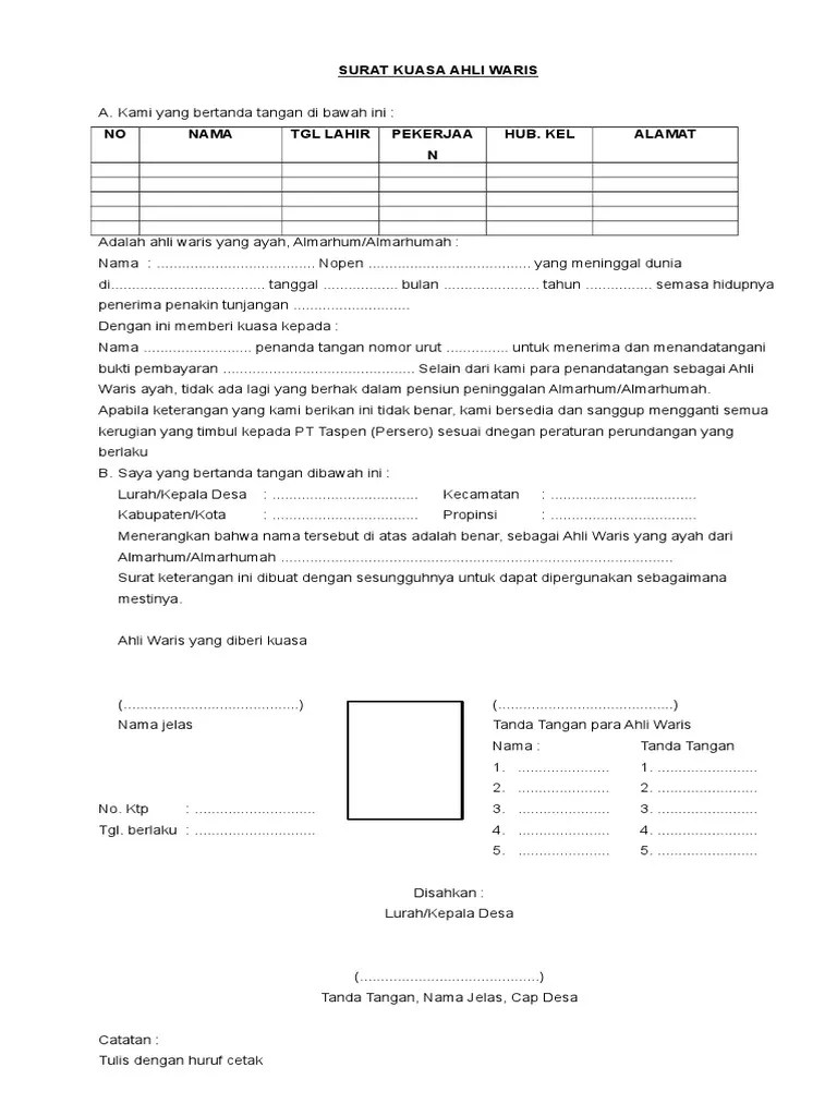 Contoh surat keterangan ahli waris dari lurahkepala desa - Ahli waris berdasar hubungan darah dan perkawinan meliputi anak atau keturunannya dan ahli waris berdasar hubungan perkawinan adalah istri atau suami pewaris. Surat keterangan ahli waris merupakan surat keterangan yang isinya adalah pernyataan bahwa pihak pembuat surat keterangan ahli waris tersebut memang benar benar berhak atas segala sesuatu yang diwariskan oleh seseorang. Contoh surat keterangan ahli waris ini tentunya akan menjelaskan tentang siapa saja ahli waris dari seseorang pewaris sehingga harta peninggalan dari pewaris menjadi jelas akan jatuh ke tangan siapa.