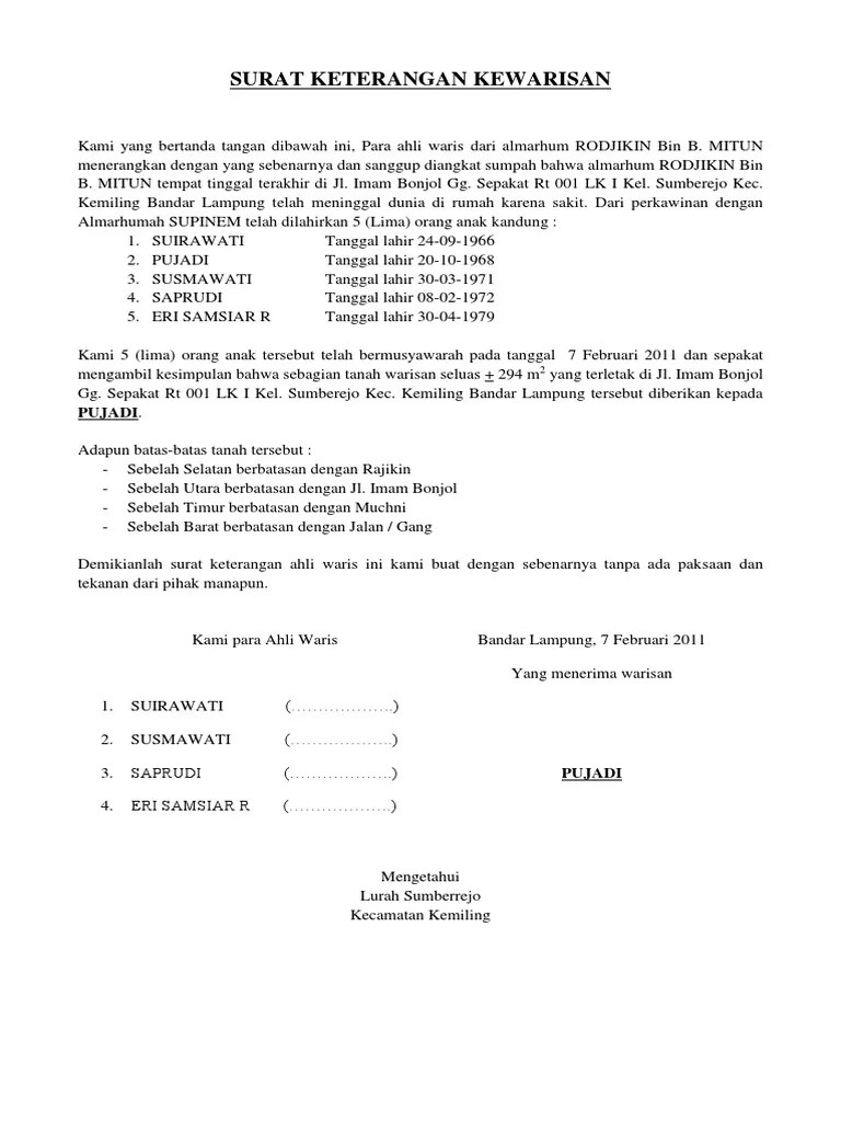 Contoh Surat Keterangan Ahli Waris Tanpa Anak - Demikian surat keterangan dan pernyataan ahli waris ini kami buat dengan sebenar benarnya diatas kertas bermaterai cukup dalam keadaan sehat jasmani dan rohani tanpa ada tekanan maupun paksaan dari siapapun dan apabila dikemudian hari keterangan dan pernyataan kami tidak benar maka kami bersedia dituntut sesuai dengan hukum yang berlaku dan. Bila dikemudian hari ternyata pernyataan ini tidak benar maka kami bersedia mempertanggungjawabkan sesuai dengan hukum dan peraturan perundang undangan yang berlaku. Siapkan juga fotocopy surat nikah orang tua di legalisir oleh kua setempat jika yang mengurus anak. Contoh surat keterangan ahli waris ini tentunya akan menjelaskan tentang siapa saja ahli waris dari seseorang pewaris sehingga harta peninggalan dari pewaris menjadi jelas akan jatuh ke tangan siapa. Cara buat dan contoh surat keterangan bebas narkoba tanpa adanya surat keterangan ahli waris seseorang yang merupakan ahli waris tidak bisa mengambil dan menguasai harta warisan. Ok gan artikel nya sangat membantu tpi gan bisa beri contoh surat pernyataan gk buat saya permasalahan nya begini. Contoh Surat Keterangan Ahli Waris Tanpa Anak Adapun ahli waris merupakan orang orang yang berhak atas harta warisan yang ditinggalkan oleh pewaris. Istri meninggal tanpa anak keluarga yang ditinggalkan.