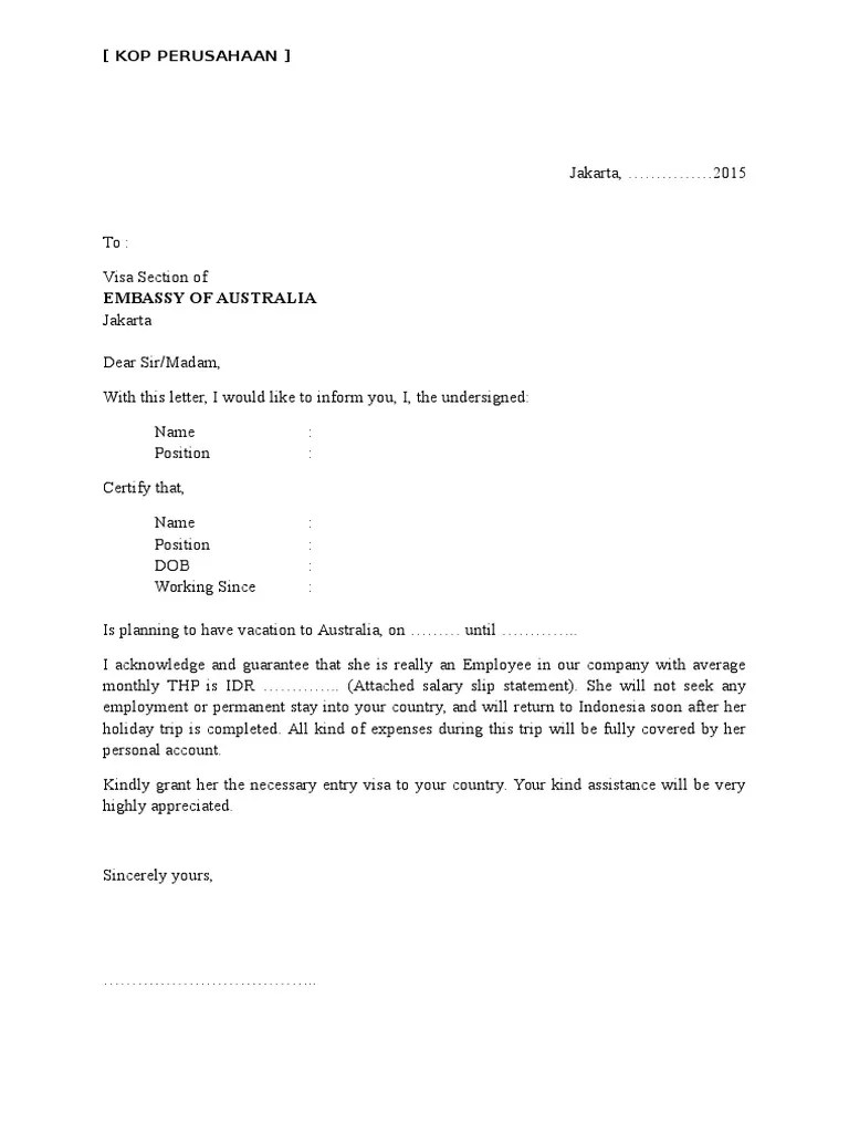 Contoh Surat Keterangan Perusahaan Untuk Pembuatan Visa - Demikian surat keterangan ini diterbitkan untuk dapat dipergunakan seperlunya. Surat sponsor referensi dari perusahaan tempat anda bekerja menyatakan anda adalah karyawan dari. Karena dengan adanya surat sponsor visa ini maka pihak kedutaan besar memiliki daftar pic atau orang yang akan bertanggung jawab terhadap kita atau orang yang disebutkan dalam surat sponsor apabila terjadi sesuatu. Karena itu aku ingin berbagi salah satu contoh surat keterangan kerja yang aku buat untuk keperluan pengajuan visa ketika aku memiliki usaha sendiri. Contoh surat sponsor visa australia yang baik dan benar sebagai referensi pembuatan persyaratan pengajuan visa untuk berbagai keperluan. Contoh surat keterangan kerja untuk visa salah satu persyaratan yang harus dipenuhi saat mengajukan visa turis ke keluar negri adalah surat keterangan kerja. Contoh Surat Keterangan Perusahaan Untuk Pembuatan Visa Surat ini dicetak di kertas dengan kop surat perusahaan jika ada dan ditulis dalam bahasa inggris. Sleman 12 januari 2019 bidan.