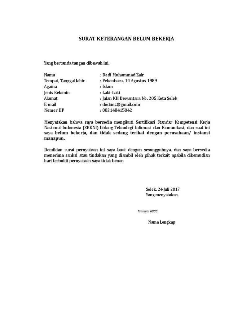 Contoh Surat Keterangan Tidak Bekerja Di Instansi Manapun - Banyak instansi pemerintah yang wajib menyertakan surat pernyataan tidak bekerja di instansi lain sebagai salah satu syarat pendaftaran atau lolos tahap seleksi administrasi. Surat keterangan sudah menikah ini merupakan salah satu dokumen yang wajib untuk anda miliki sebagai bukti tambahan bahwa anda telah menikah selain adanya buku. Pas foto ukuran 3 x 4 sebanyak 7 tujuh lembar 10. Inilah pembahasan lengkap terkait surat keterangan tidak sedang menjalani tugas belajar dan ikatan dinas. Surat keterangan tidak mengkonsumsi narkoba dari unit pelayanan kesehatan pemerintah. Sleman 25 desember 2018 ketua rt 006. Contoh Surat Keterangan Tidak Bekerja Di Instansi Manapun Surat pernyataan bermaterai 6000 tidak berkedudukan sebagai pns 9. Tempat tanggal lahir.