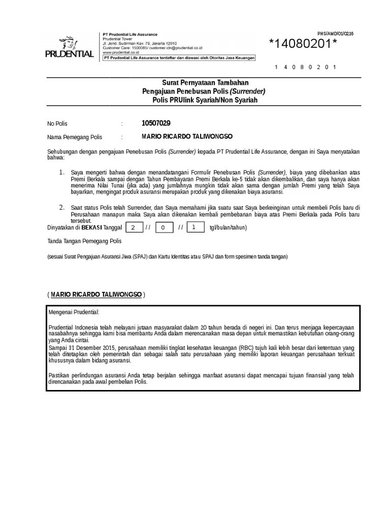 Contoh Surat Klaim Asuransi Prudential - Parkinson alzheimer motor neuron multiple sclerosis. Surat keterangan dokter dan atau resume medis rawat inap yang telah diisi lengkap dan jelas oleh dokter yang merawat tertanggung 3. Contoh polis asuransi jiwa prudential yang benar yakni diawali dengan ucapan selamat beserta terima kasih dari perusahaan lalu data nasabah data premi hak dan. Formulir klaim rawat inap dan surat kuasa pemberian rekam medis asli yang telah diisi dengan benar jelas dan lengkap. Pembaca yang terhormat sehubungan dengan keluhan saya mengenai klaim asuransi kematian dari prudential pihak prudential telah mengubungi dan menjelaskan kepada ahli waris bahwa prudential telah melakukan kewajibannya pada tanggal 01 maret 2019 namun karena proses kliring maka ahli waris baru menerima dana klaim kematian pada tanggal 06 maret 2019. Surat keterangan dokter skd asli yang telah diisi dan ditandatangani oleh dokter yang merawat dan diberi cap oleh. Contoh Surat Klaim Asuransi Prudential Lihat dan pelajari semua produk prudential indonesia dari asuransi jiwa asuransi karyawan hingga asuransi kesehatan di indonesia. Saya heran dengan asuransi sebesar prudential yang kinerjanya seperti ini.