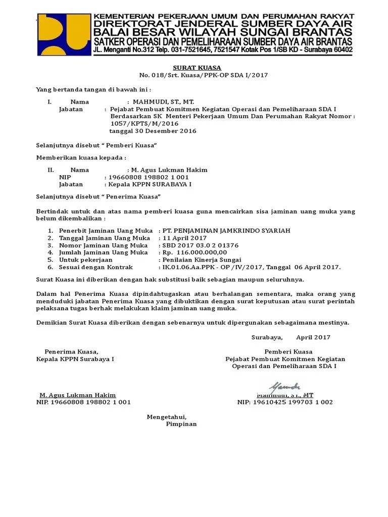 Contoh Surat Kuasa Pencairan Jaminan Uang Muka - Contoh surat keabsahan dokumen contoh surat kuasa contoh surat rasmi contoh surat lamaran kerja contoh surat lamaran contoh surat menyurat contoh surat perjanjian contoh surat jalan contoh surat undangan contoh surat pernyataan contoh surat resign contoh surat peringatan contoh surat pengantar. Isi surat jaminan uang muka harus mencantumkan ketentuan bahwa kepala kppn yang menerbitkan sp2d uang muka berdasarkan surat kuasa pemegang jaminan obligee dapat mengajukan tuntutan klaim penagihan kepada penjamin sampai. 1 satu berkas. Pemberian uang muka sifatnya optional. Contoh surat kuasa jaminan sertifikat tanah lengkap dan terbaru apa anda ingin mengajukan pinjaman dengan nama orang lain teman saudara ataupun orang tua ke bank maka di butuhkan beberapa surat kuasa yang telah kami susun nantinya anda tinggal ganti nama saja. Kuasa pengguna anggaran kegiatan pembangunan sarana dan prasarana rumah sederhana sehat dinas pekerjaan umum provinsi kalimantan timur di samarinda perihal. Contoh Surat Kuasa Pencairan Jaminan Uang Muka Disebut sebagai pihak kedua. Besaran nilai jaminan uang muka senilai uang muka.