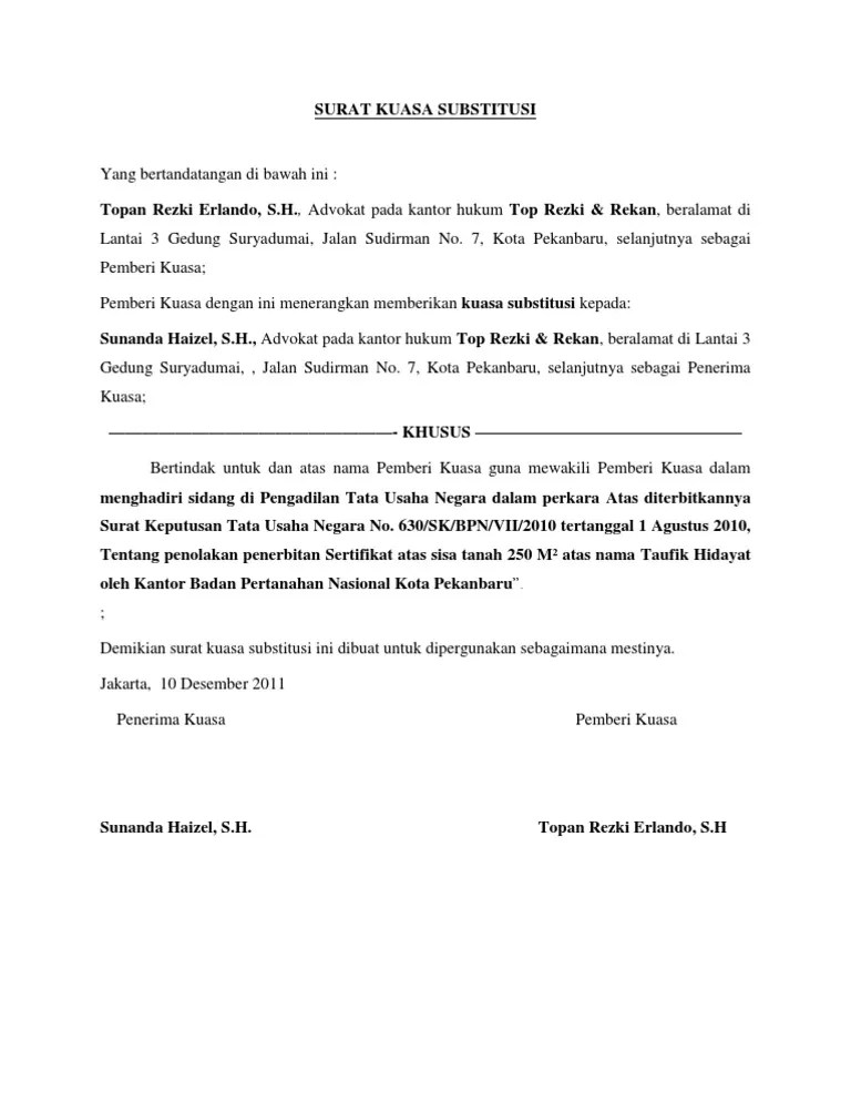 Contoh surat kuasa substitusi tata usaha negara - Mewakili pemberi kuasa untuk. 06 ii 1180 2015 tentang pencabutan izin usaha toko harum manis jaya. Untuk dan atas nama pemberi kuasa mendampingi dan atau mewakili pemberi kuasa dalam membela dan mempertahankan segala hak dan kepentingan hukum pemberi kuasa di pengadilan tata usaha negara medan atas diterbitkannya surat mutasi dengan no.