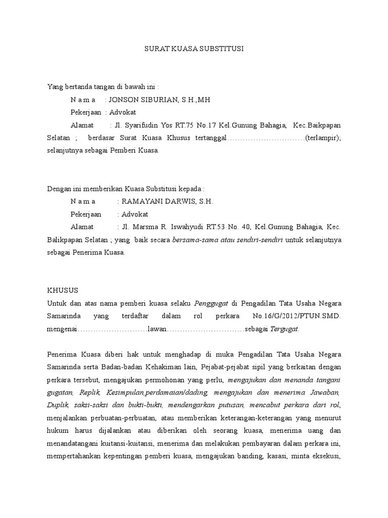 Contoh Surat Kuasa Substitusi Tata Usaha Negara - Contoh gugatan berdasarkan pasal 3 uu peratun. Hak hak penerima kuasa yang berupa hak substitusi dan hak retensi. Contoh surat kuasa khusus tata usaha negara have a graphic from the other contoh surat kuasa khusus tata usaha negara in addition it will feature a picture of a kind that may be observed in the gallery of contoh surat kuasa khusus tata usaha negara. Gambar contoh surat kuasa khusus tata usaha negara terbaik 2019. Penerima kuasa diberi hak untuk menghadap di muka pengadilan tata usaha negara samarinda serta badan badan kehakiman lain pejabat pejabat sipil yang berkaitan dengan perkara tersebut mengajukan permohonan yang perlu mengajukan dan menanda tangani gugatan replik kesimpulan perdamaian dading mengajukan dan menerima jawaban duplik saksi saksi dan bukti bukti mendengarkan putusan. Demikian surat kuasa dan kekuasaan ini dapat dialihkan kepada orang lain dengan hak substitusi dan seterusnya menurut hukum seperti yang dimaksud dalam pasal 1812 kuh perdata dan menurut syarat syarat lainya ditetapkan dalam undang undang. Contoh Surat Kuasa Substitusi Tata Usaha Negara Berikut contoh format surat gugatan dan surat kuasa pengadilan tata usaha negara makassar. Pristy atas diterbitkannya surat keputusan walikota jambi nomor.