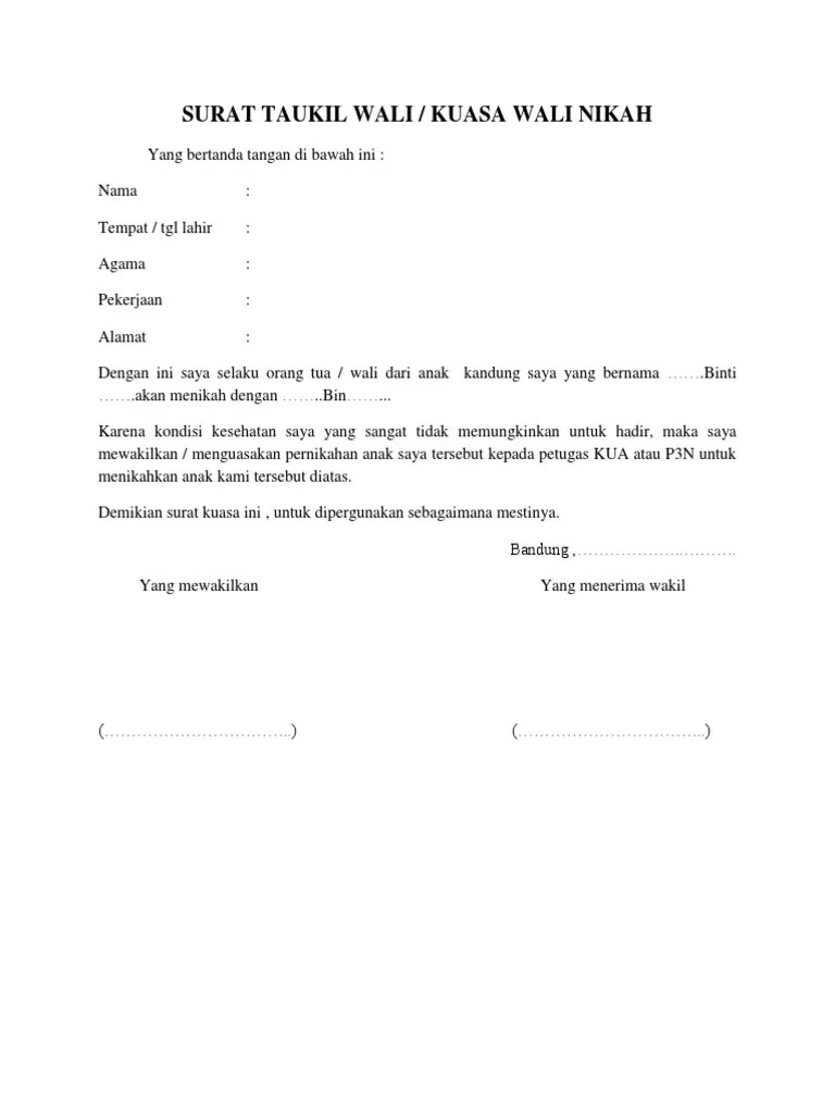 Demikian surat pernyataan ini saya buat dengan sebenarnya tanpa ada paksaan dari pihak mana pun untuk dapat dipergunakan sebagaimana mestinya. Jakarta yang mewakilkan yang menerima wakil. Biasanya apabila seorang wali nikah berhalangan hadir atau sudah meninggal maka wali nikah akan diwakilkan oleh saudara kandungnya kemudian penghulu lalu.