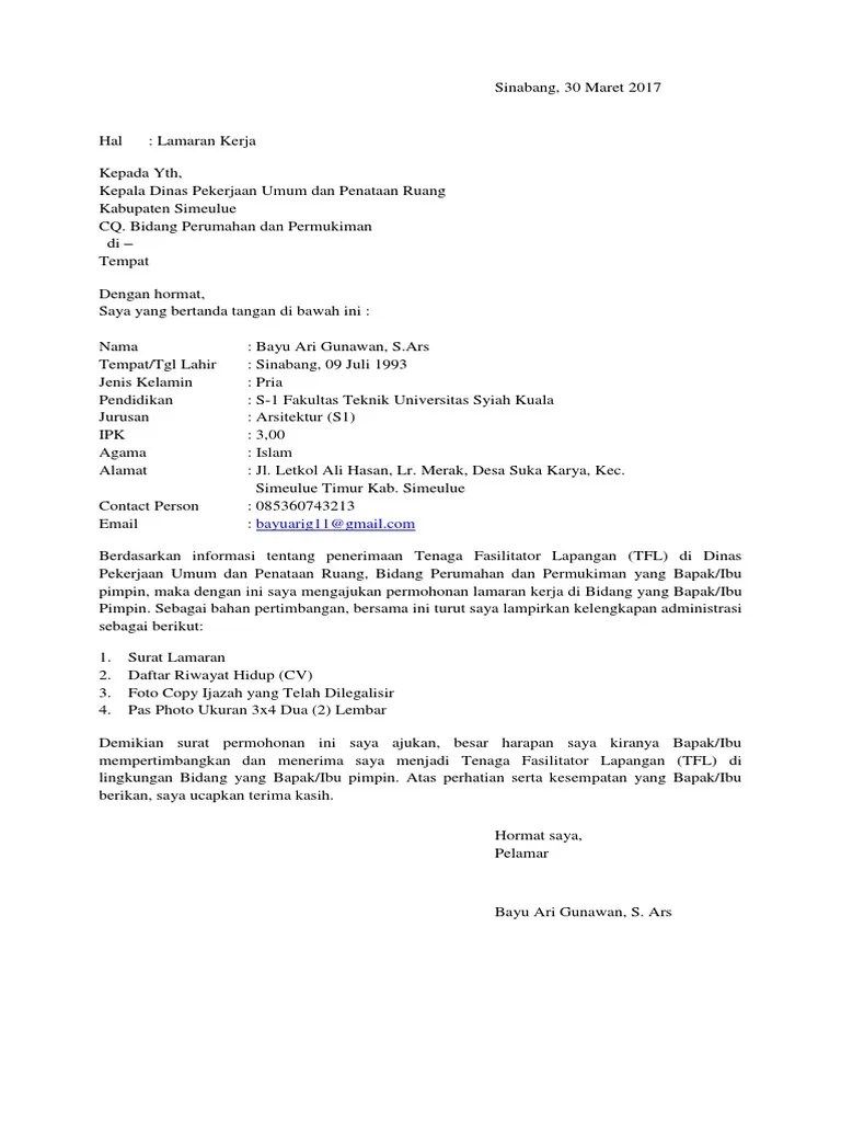 Contoh lamaran pekerjaan tenaga fasilitator lapangan bsps surat lamaran kerja comment hal. Bandar lampung 23 november 2019. Contoh surat lamaran kerja untuk mendapat pekerjaan kita terlebih dahulu harus mempersiapkan semua yang dibutuhkan seperti surat lamaran pekerjaan di mana surat lamaran pekerjaan adalah surat yanbg bertujuan untuk memberitahukan niat kita untuk mendapatkan suatu pekerjaan di tempat yang ditujukan.