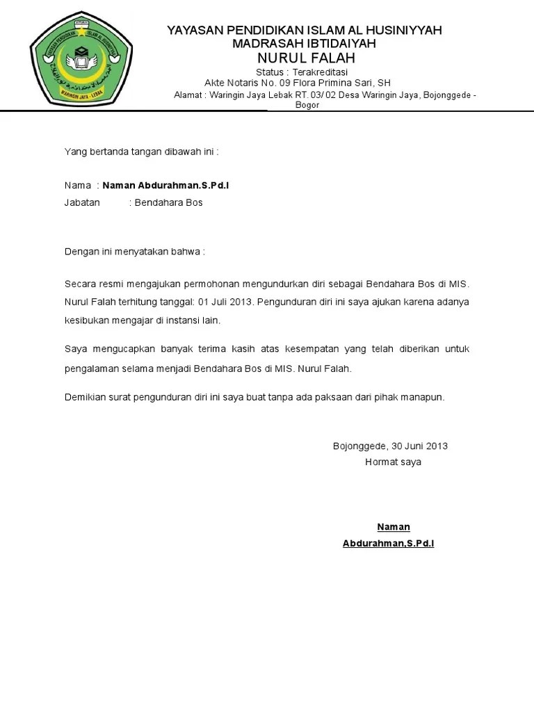 Contoh Surat Pengunduran Diri Dari Bendahara Bos - Contoh surat pengunduran diri menjadi bendahara se. Gambar ini tersedia dalam format jpg png gif. Mengundurkan diri adalah sesuatu yang wajar dilakukan oleh siapaun yang berada dalam sebuah tanggung jawab perusahaan organisasi atau instansi lainnya. Blog contohdara memiliki banyak koleksi gambar seperti contoh surat pengunduran diri bendahara bos.
