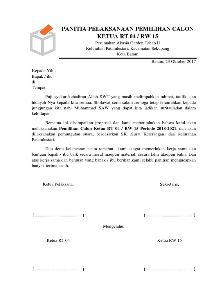 Contoh Surat Pengunduran Diri Dari Calon Ketua Rt - Cocok digunkan sebagai surat pengunduran diri dari jabatan di pemerintah desa seperti ketua rt rw. Pemberitahuan dan persyaratan menjadi calon ketua rt 02 rw 11. Anda baru saja membaca artikel yang berkategori example dengan judul contoh surat pengunduran diri dari rt. Contoh surat pengunduran diri atau contoh surat resign yang baik dan benar. Sering kali memang terlalu banyak alasan yang membuat seseorang tidak nyaman bekerja atau beraktivitas di instansi atau perusahaan tertentu. Contoh surat pengunduran diri adalah jenis surat yang banyak diperlukan saat ini baik di kantor ia bekerja maupun di sekolah sekolah juga organisasi tempat dia berkecimpung selama ini biasanya surat ini dibuat ketika akan mengembangkan kemampuan dan ilmunya di tempat lain atau juga bisa jadi karena sudah tidak cocok dengan tempatnya yang sekarang dan ingin mencari suasana baru. Contoh Surat Pengunduran Diri Dari Calon Ketua Rt Setelah sebelumnya saya membahas tentang contoh surat lamaran kerja kali ini saya akan membahas contoh surat pengunduran diri yang baik dan benar. Contoh form pendaftaran calon ketua rt dan ketua rw yang bisa dibuat untuk syarat pemilihan menjadi ketua lingkungan yang baru.