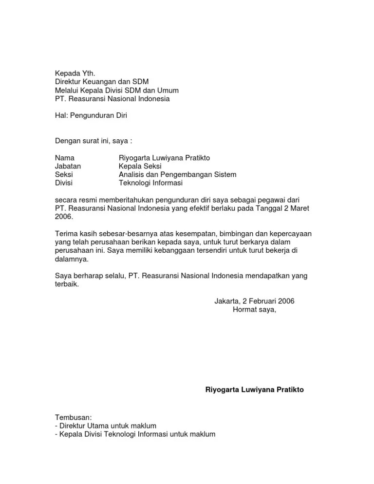 Surat ini tidak hanya sekedar formalitas saja tetapi juga mencerminkan anda sebagai pegawai yang baik dan sopan. Pluit selatan raya kav 1 14440 jakarta utara dengan hormat bersama surat ini saya indra bekti mengajukan permohonan mengundurkan diri sebagai karyawan dari pt. Kepala sekolah menengah pertama insan utama bogor jl.