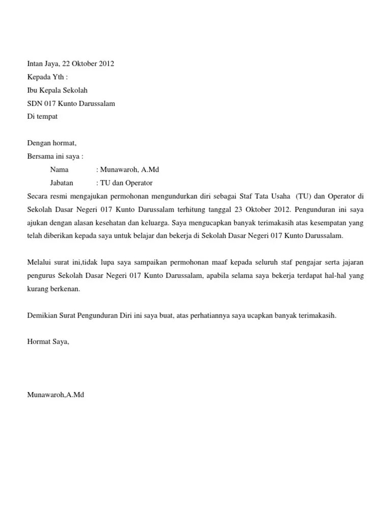 Contoh surat pengunduran diri untuk operator sekolah 16 30 no comments mohon maaf informasi ini tidak bermaksud mempengaruhi rekan rekan ops agar mengundurkan diri dari jabatan tersebut namun tujuannya tidak lain hanyalah berbagi dan memperlihatkan kesopanan kita pada pimpinan di suatu organisasi kepala sekolah agar tetap bisa menjaga. Contoh surat pengunduran diri atau contoh surat resign yang baik dan benar. Mengundurkan diri adalah sesuatu yang wajar dilakukan oleh siapaun yang berada dalam sebuah tanggung jawab perusahaan organisasi atau instansi lainnya.