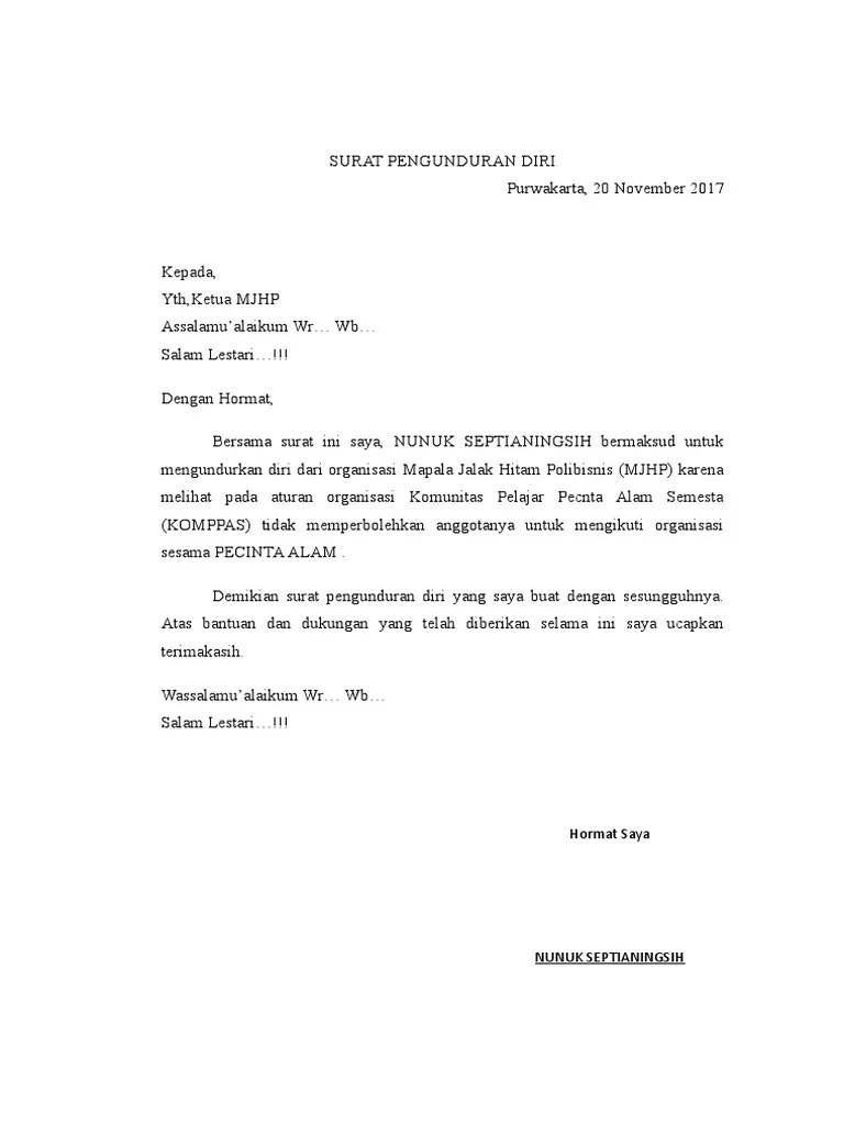 Contoh Surat Pengunduran Diri Dari Organisasi Pecinta Alam - Contoh surat tugas organisasi. 7 malang jawa timur 65144 telp. Karena itu mengundurkan diri dari organisasi kampus yang diikuti menjadi pilihan terakhir. 15 contoh surat pengunduran diri dari organisasi paling lengkap keputusan untuk mengundurkan diri dari suatu perkumpulan atau kelompok tentu merupakan keputusan yang besar dan bisa memberikan dampak tertentu terhadap diri anda sendiri.