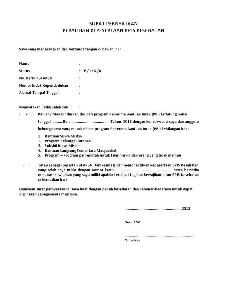 Contoh Surat Pengunduran Diri Dari Peserta Bpjs - Tidak hanya dari perusahaan tetapi juga bpjs mandiri pun anda perlu membuat surat pernyataan seperti yang telah dicontohkan di atas. Dikala kita berhenti memakai layanan bpjs baiknya kita memperlihatkan sebuah surat pernyataan pengunduran diri dari layanan bpjs. Contoh surat pernyataan pengunduran diri dari bpjs kesehatan masyarakat singkat bpjs badan penyelenggara jaminan sosial adalah salah satu instansi yang menjamin kesehatan masyarakat. Berikut ini yakni sebuah pola surat pengunduran diri dari langganan layanan bpjs. Data data mengenai contoh surat permohonan penambahan peserta bpjs kesehatan. Bagi anda yang merupakan karyawan atau pegawai perusahaan dan kemudian mengundurkan diri dari. Contoh Surat Pengunduran Diri Dari Peserta Bpjs Contoh surat pengunduran diri resign kerja untuk ambil jht bpjs bagi karyawan perusahaan yang mengikuti acara jht bpjs ketenagakerjaan dan telah mengundurkan diri resign mampu mencairkan mengambil saldo jht bpjs salah satu syarat yang harus dipenuhi untuk proses pengambilan jht yaitu surat pengunduran diri. Kami mengulas tentang surat pernyataan pengunduran diri sebagai peserta pbi.