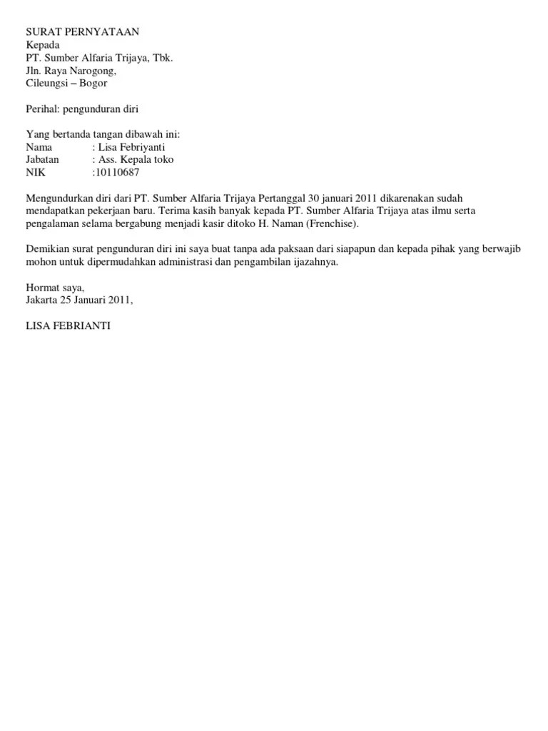 Contoh surat pengunduran diri dari pt sumber alfaria trijaya - Menerangkan bahwa pertanggal 25 juni 2015 saya mengundurkan diri sebagai karyawan pt. Dengan hormat bersama surat ini saya bermaksud mengajukan permohonan bergabung di perusahaan yang bapak ibu pimpin. Faisal anam nik.