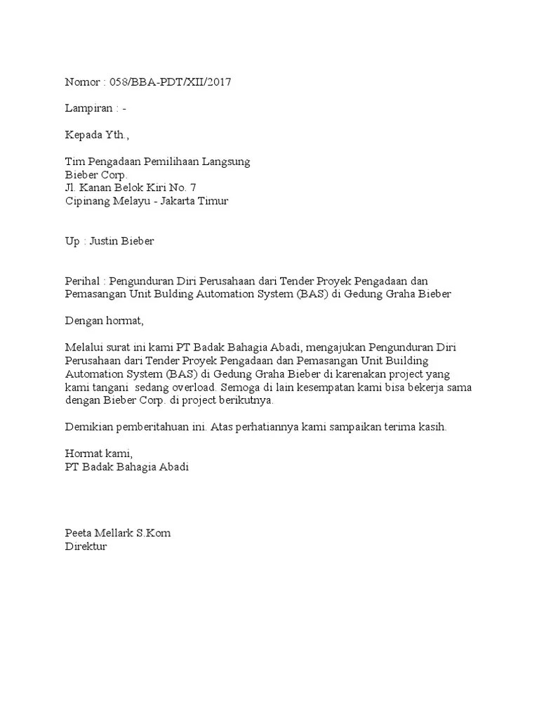 Contoh surat pengunduran diri dari tender proyek - Download contoh surat pengunduran diri perusahaan dari tender proyek doc. Makassar 11 juni 2018. Setelah sebelumnya saya membahas tentang contoh surat lamaran kerja kali ini saya akan membahas contoh surat pengunduran diri yang baik dan benar.