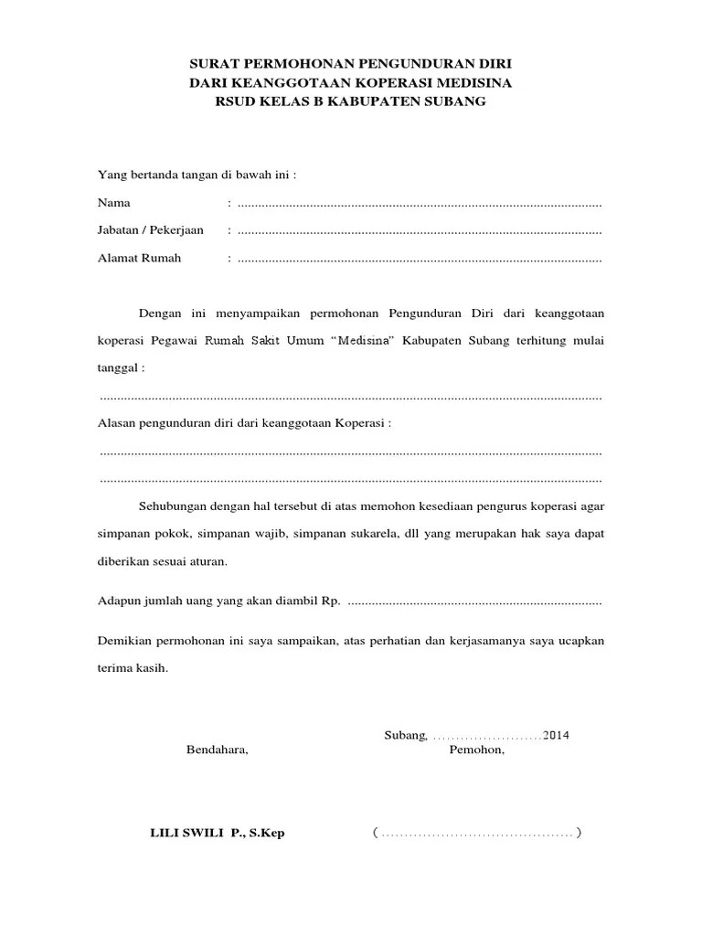 Contoh Surat Pengunduran Diri Kerja Dari Koperasi - 6000 untuk memperkuat pernyataan anda di mata hukum. Di bawah ini akan kami berikan daftar beberapa contoh surat pengunduran diri kerja anda dari perusahaan anda. Contoh surat pengunduran diri kerja dari perusahaan sekarang ini ada banyak sekali perusahaan yang bergerak di indonesia baik itu perusahaan penyedia jasa maupun perusahaan penyedia produk. Contoh surat pengunduran diatas cukup simple dan sederhana cocok bila dipakai untuk mengundurkan diri dari instansi kecil semacam koperasi.