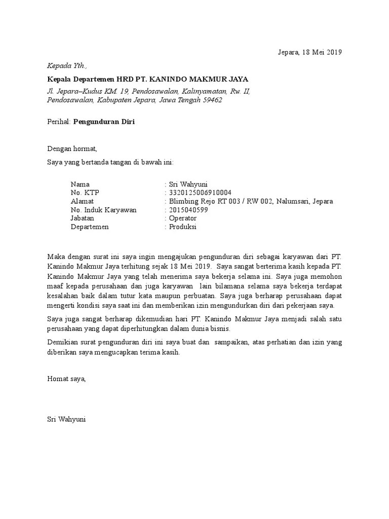 Contoh surat pengunduran diri operator produksi - Contoh surat pengunduran diri operator produksi contoh file berikut ini adalah kumpulan dari berbagi sumber tentang contoh surat pengunduran diri operator produksi yang bisa bapak ibu gunakan dan diunduh secara gratis dengan menekan tombol download biru dibawah ini. Setelah sebelumnya saya membahas tentang contoh surat lamaran kerja kali ini saya akan membahas contoh surat pengunduran diri yang baik dan benar. Contoh surat pengunduran diri ke bank contoh surat pengunduran diri dari perusahaan.