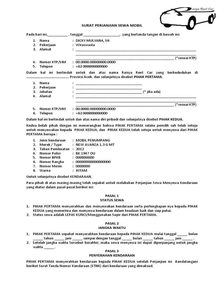 Contoh Surat Perjanjian Rental Mobil Bulanan - Teknik penulisan surat sewa mobil. Contoh surat perjanjian sewa rental mobil diatas termasuk simple dan singkat. Namun apapun bentuknya mau pribadi atau usaha tentunya membutuhkan perjanjian yang mengikat kedua belah pihak penyewa dengan yang menyewakan. Surat perjanjian kerjasama usaha rental mobil.