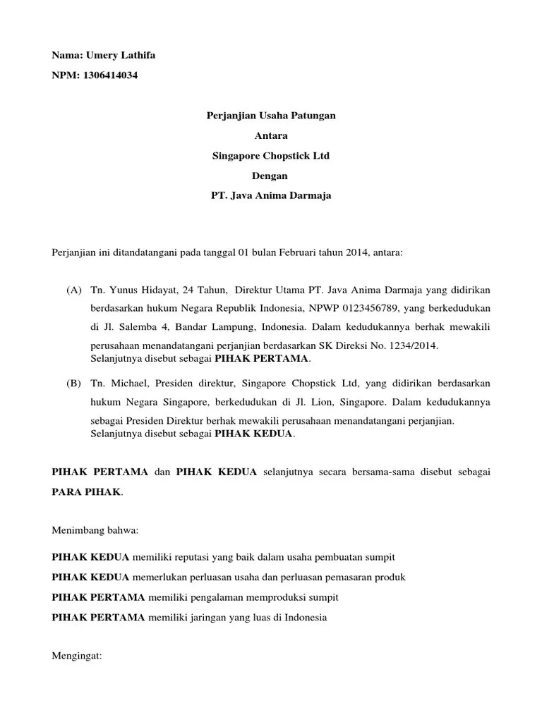 Contoh surat perjanjian usaha patungan - 1 maksud dan tujuan dari perjanjian kerjasama usaha patungan ini adalah membagi keuntungan para pihak secara adil sesuai dengan kesepakatan kedua belah pihak. Contoh surat perjanjian kerjasama ada sangat banyak jenis kerjasama yang mudah kita temukan sekarang ini. Berikut sedikit cuplikan dari surat ini yang bisa anda download dalam format doc microsoft word document melalui link di bagian bawah artikel ini.