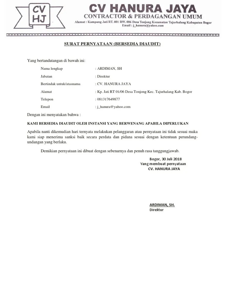 Contoh surat pernyataan bersedia diaudit - Beberapa hal berikut ini adalah contoh penggunaan surat pernyataan. Namun untuk urusan komunikasi perusahaan maupun berbagai lembaga maupun instansi pemerintah penggunaan surat masih merupakan sesuatu hal yang wajib untuk dilakoni. Hendy rachman b jabatan.