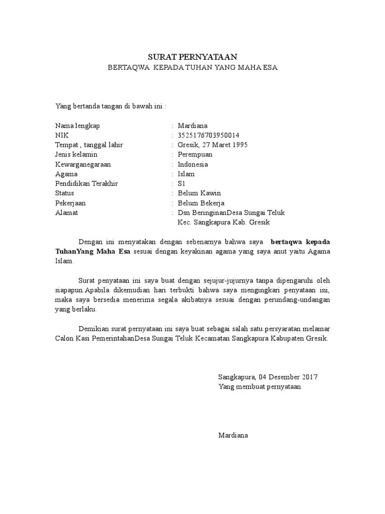 Contoh Surat Pernyataan Bertaqwa Kepada Tuhan Yang Maha Esa Pdf - Contoh format surat pernyataan bertaqwa kepada tuhan yang maha esa. Surat pernyataan bertaqwa kepada tuhan yang maha esa. Itulah contoh surat pernyataan bertaqwa kepada tuhan yang dapat admin kumpulkan. Contoh surat pernyataan bertakwa kepada tuhan yang maha esa ini biasanya dibuat untuk keperluan pendaftaran perangkat desa calon legislatif kepala desa pendaftaran cpns maupun untuk kepentingan lain secara dinas dan non dinas misalnya untuk mendapatkan pekerjaan. 81 tahun 2016 tentang persyaratan pengangkatan perangkat desa. Demikian ulasan contoh surat pernyataan bertaqwa kepada tuhan yang maha esa yme calon kepala desa semoga contoh format surat pernyataan tersebut dapat bermanfaat untuk anda semua. Contoh Surat Pernyataan Bertaqwa Kepada Tuhan Yang Maha Esa Pdf Surat pernyataan bertaqwa kepada tuhan yang maha esa yang dibuat oleh yang bersangkutan di atas kertas bermaterai cukup. Apa fungsi surat pernyataan bertaqwa kepada tuhan yang maha esa cara membuat surat pernyataan bertaqwa kepada tuhan yang maha esa bukti pernyaataan bahwa setia kepada pancasila sila pertama persyaratan melamar menjadi pegawai pemerintah kelurahan desa pns contoh surat pernyataan bertaqwa kepada tuhan yang maha esa kelurahan desa saya bertaqwa kepada tuhan yang maha esa sesuai agama dan.