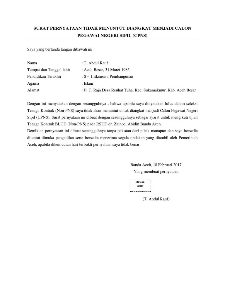 Contoh Surat Pernyataan Bukan Cpns Pns Karyawan - Contoh surat pernyataan cpns surat pernyataan cpns digunakan untuk persyaratan mendaftar pns biasanya untuk setiap kementerian memiliki format surat yang hampir sama hanya saja beberapa persyaratan dan beberapa data saja yang membedakan. Untuk lebih jelas sebaiknya perhatikan contoh surat pernyataan dari beberapa fungsi. Dalam bentuknya jika disebutkan secara lisan pernyataan sulit untuk dapat dibuktikan kecuali bila ada saksi. Contoh surat lamaran kerja cpns di lingkungan daerah kabupaten kota setempat.