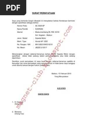 Contoh surat pernyataan kehilangan bpkb motor - Jenis surat pernyataan yang sangat beragam mungkin membuat anda merasa kebingungan ketika harus membuat salah satu jenis surat. Demikian surat pernyataan ini saya buat dengan sebenar benarnya informasi yang diberikan saya tidak akan bertanggung jawab bila terjadi berbagai tindakan kriminal yang mengatas namakan stnk bpkb dan juga sim c tersebut. Mujiono tempat tanggal lahir.