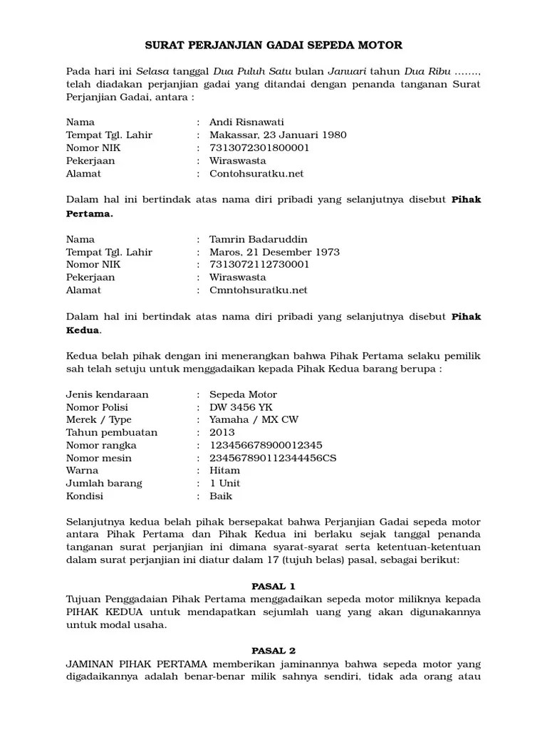 Demikian surat pernyataan ini saya buat dengan sebenar benarnya informasi yang diberikan saya tidak akan bertanggung jawab bila terjadi berbagai tindakan kriminal yang mengatas namakan stnk bpkb dan juga sim c tersebut. Contoh surat kehilangan barang. Berikut ini contoh surat perjanjian gadai sepeda motor lengkap dengan pasal pasal yang berisi seluruh ketentuan gadai dan mengikat pihak terkait.