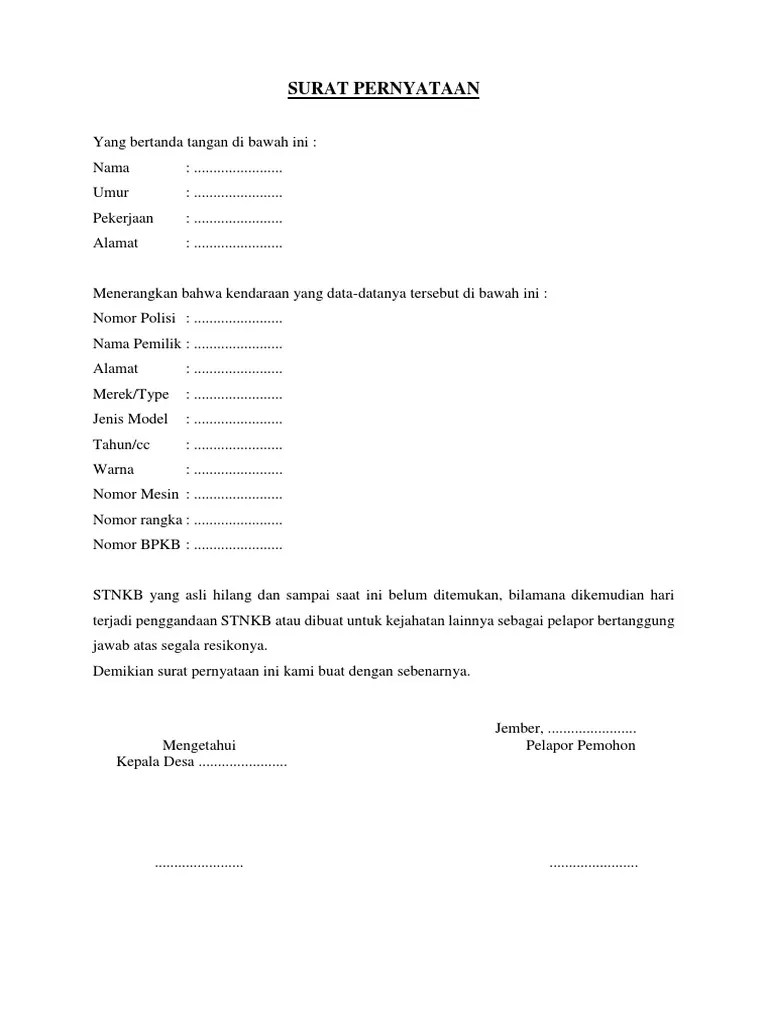 Contoh Surat Pernyataan Kehilangan Stnk - Kemudian surat izin mengemudi c sim c yang hilang tersebut memiliki berbagai data sebagai berikut. Perlu admin beritahukan bahwa portal website kumpulan contoh surat berisi contoh surat bisnis surat dinas surat izin surat kuasa surat lamaran. Contoh surat pernyataan kehilangan. Kehilangan menunjukkan rasa yang tidak sepenuhnya utuh merasa kurang tanpa hadirnya sesuatu.