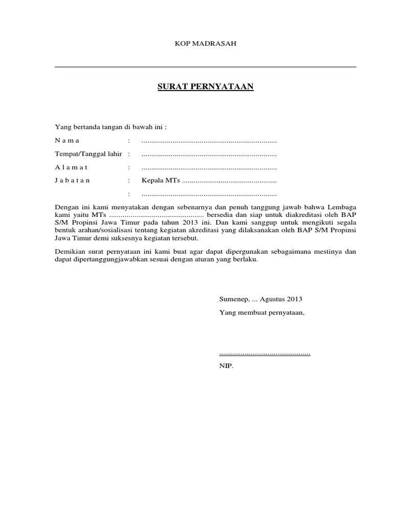 Contoh Surat Pernyataan Kesanggupan Akreditasi - Contoh surat pernyataan kesanggupan akreditasi sekolah. Ada banyak contoh surat pernyataan yang biasanya banyak digunakan mulai dari surat pernyataan belum menikah surat pernyataan diri surat pernyataan menyesal sampai dengan surat pernyataan kesanggupan. Bersama dengan surat pernyataan ini maka saya menyatakan bahwa saya memiliki tempat praktek yang beralamatkan di desa suka maju. Pada postingan kali ini saya akan membehas mengenai permasalahan yang berhubungan dengan pemberlakuan kurikulum 2013.