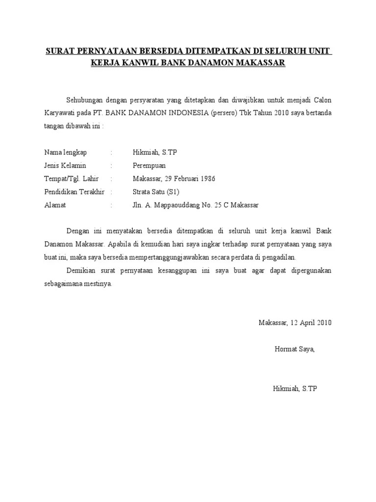 Contoh Surat Pernyataan Kesanggupan Membuat Sip - Yang membuat pernyataan untuk download draf surat diatas format ms word silahkan ikuti link berikut. Semoga dapat bermanfaat bagi anda yang membutuhkannya. Contoh surat lamaran terbaru danterbaik tahun ini pt pim. Contoh surat pernyataan kesanggupan bekerja lembur.