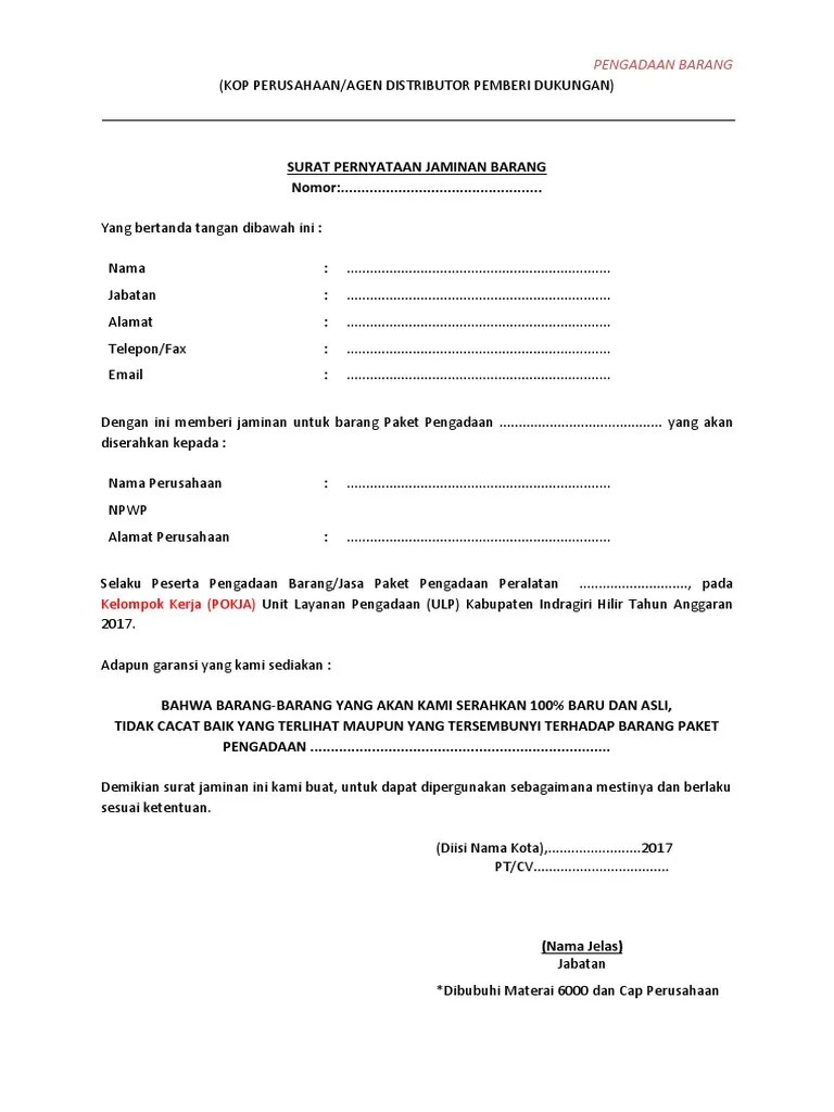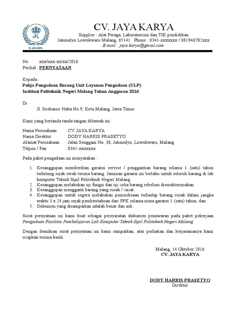 Contoh Surat Pernyataan Kesanggupan Pengadaan Barang - Yang bertanda tangan dibawah ini. Jadi ketika perusahaan lain menilai perusahaan anda sebagai salah satu perusahaan yang menjanjikan maka mungkin saja mereka akan mengirimkan surat penawaran barang kepada perusahaan anda. Lembaga kebijakan pengadaan barang jasa pemerintah republik petunjuk teknis purbalingga 7 masalah sengketa kontrak 2023 pemutusan kontrak wanprestasi kementerian pekerjaan umum dan surat perjanjian kerjasama spks. Disini anda dituntut untuk menulis dengan sebenarnya dan harus menepati pernyataan tersebut. Demikian surat pernyataan ini kami buat dengan sebenar benarnya untuk melengkapi persyaratan sebagai peserta pengadaan barang dan jasa untuk pemerintah. Cv pesona mawar melati. Contoh Surat Pernyataan Kesanggupan Pengadaan Barang Contoh surat pernyataan kesanggupan membayar ganti rugi surat ini dibuat oleh seseorang yang telah melakukan perjanjian yang mempunyai kekuatan hukum misalnya sewa rumah. Lampiran 12 contoh surat.
