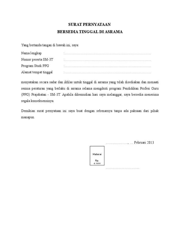 Contoh Surat Pernyataan Kesanggupan Tinggal Di Lokasi Tugas - Jenis surat pernyataan yang sangat beragam mungkin. 15 contoh surat pernyataan diri yang baik dan benar seiring dengan perkembangan zaman dan kecanggihan teknologi sekarang ini penggunaan surat sebagai alat komunikasi juga semakin menurun. Sementara untuk menyatakan diri sendiri anda tinggal mencantumkan identitas diri sendiri lalu kemudian isi pernyataan ditutup dengan nama dan tanda tangan anda sebagai pembuat pernyataan. Ada banyak contoh surat pernyataan yang biasanya banyak digunakan mulai dari surat pernyataan belum menikah surat pernyataan diri surat pernyataan menyesal sampai dengan surat pernyataan kesanggupan. 4 surat pernyataan kesanggupan kerja dan contoh formatnya surat pernyataan kesanggupan merupakan sebuah surat yang dibuat untuk memberitahukan bahwa orang yang dituju telah sanggup dan bersedia untuk menjalankan tugas yang diberikan serta bersedia menanggung resiko apapun jika terbukti bersalah. Jenis surat ini dibuat oleh satu pihak dan ditujukan kepada pihak lain dan bertujuan untuk memberikan pernyataan atau kesanggupan pihak pertama sesuai yang dipersyaratkan oleh pihak kedua. Contoh Surat Pernyataan Kesanggupan Tinggal Di Lokasi Tugas Dalam bentuknya jika disebutkan secara lisan pernyataan sulit untuk dapat dibuktikan kecuali bila ada saksi. 15 contoh surat pernyataan kesanggupan untuk berbagai keperluan dalam berbagai kasus dan keperluan seseorang mungkin saja memerlukan dan harus menulis surat pernyataan.