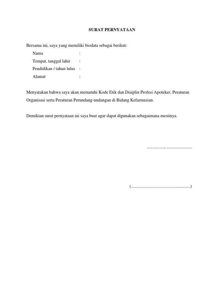Contoh Surat Pernyataan Mematuhi Kode Etik Apoteker - Tempat tanggal lahir. Demikian surat pernyataan ini saya buat dalam kondisi sehat jasmani dan rohani serta dalam keadaan sadar tanpa paksaan dari siapapun. Pernyataan ini saya buat dalam keadaan sehat jasmani dan rohani serta dalam keadaan sadar tanpa paksaan dari siapapun. Surat pernyataan mematuhi kode etik dan pedoman disiplin apoteker saya yang bertanda tangan di bawah ini.