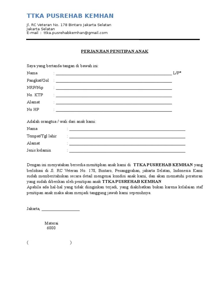 Contoh surat pernyataan menitipkan anak - Untuk anda yang ingin mengadopsi anak anda membutuhkan surat perjanjian adopsi anak. Surat ini digunakan untuk mengikat kedua belah pihak. Sebagai contoh misal seseorang direktur atau pemimpin sebuah perusahaan sering kali membuat surat pernyataan yang isinya menerangkan terkait anak buah ataupun bawahannya.