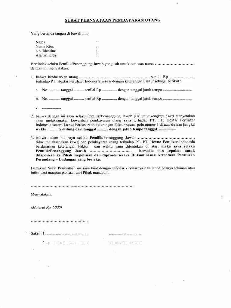Contoh Surat Pernyataan Penanggung Jawab Utang - Contoh surat pernyataan kesanggupan mengenai kesanggupan atau tidak pada beberapa kasus mungkin bisa disampaikan secara lisan. Diisi dengan jabatan yang bertanda tangan di surat pernyataan direktur presiden direktur direktur utama pimpinan perusahaan lainnya. Keterikatan tersebut berupa kewajiban anda untuk membaya hutang dan hak pemberi pinjaman untuk menagih uang yang sudah anda pinjam terlebih dahulu. Masa berlaku strttk.
