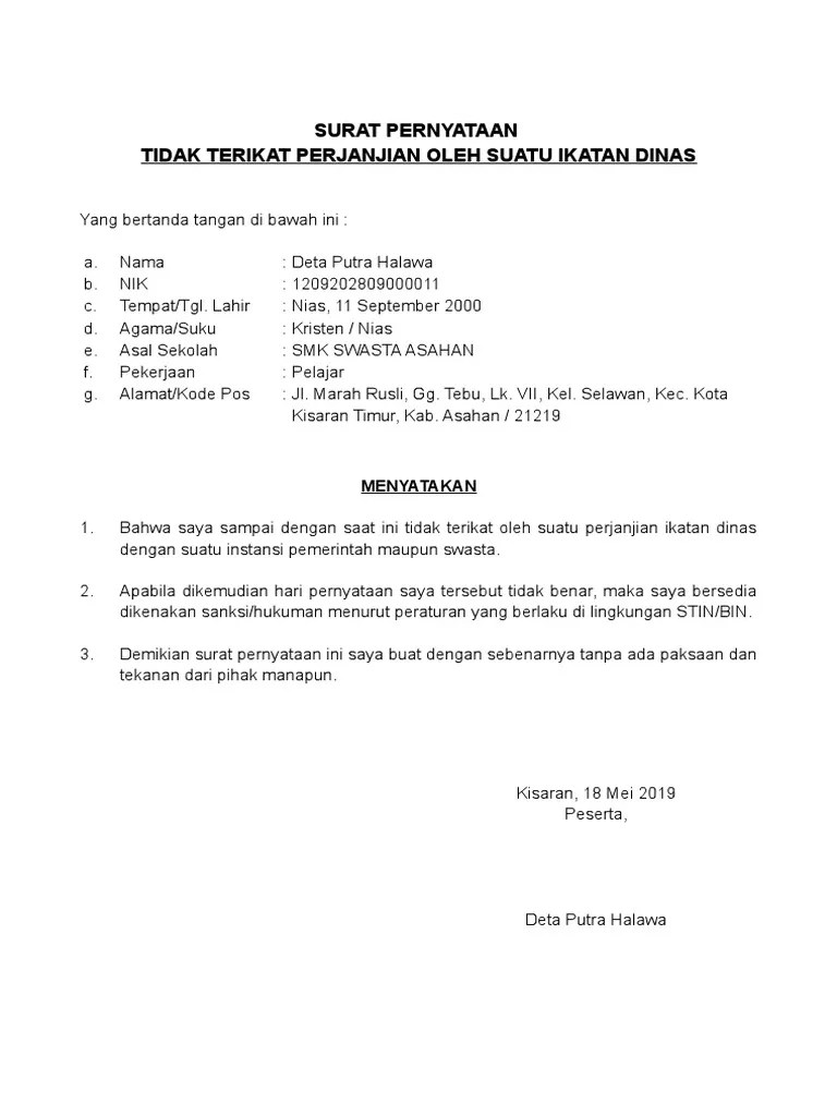 Contoh surat pernyataan pernyataan bisa dilakukan secara lisan maupun non lisan atau tertulis. 2 responses to contoh surat pernyataan tidak terikat perjanjian ikatan dinas unknown 7 april 2017 22 54 numpang nanya bg itu yg camatnya di minta tanda tangannya apa hanya di isi nama camatnya saja. Pasal 4 pengakhiran beasiswa 1.