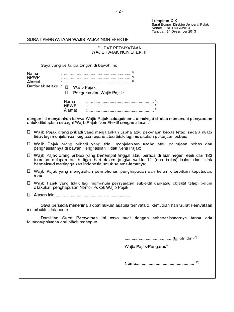 Persyaratan untuk ditetapkan sebagai wajib pajak non efektif dengan alasan. Dimanapun kita berada tentu ada peraturan dan norma norma yang harus dipatuhi. Contoh surat pernyataan wajib pajak non efektif contoh surat pernyataan non pkp contoh surat pernyataan non pns contoh surat pernyataan kesanggupan contoh surat pernyataan kerja contoh surat pernyataan pemberlakuan kurikulum contoh surat pernyataan cpns contoh surat pernyataan tidak mengulangi kesalahan contoh surat pernyataan hutang contoh surat pernyataan perjanjian contoh surat.