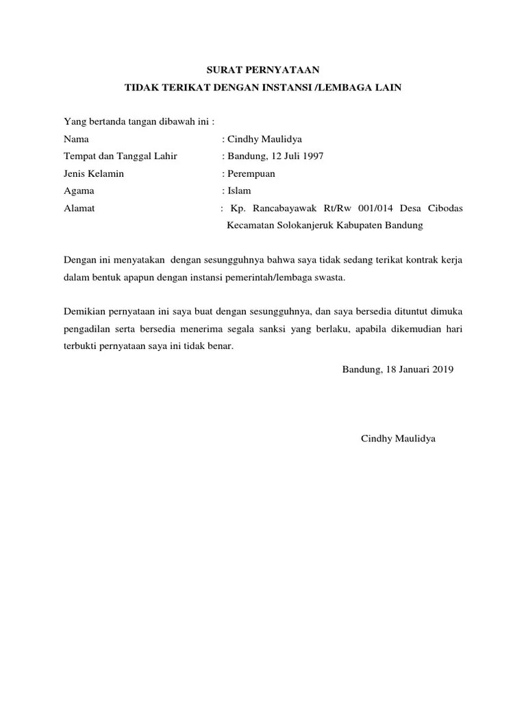 Contoh Surat Pernyataan Tidak Bekerja Di Instansi Pemerintah Bumn Swasta - Baik itu mengenai status penghasilan ataupun hal lainnya. Ketika melamar sebuah pekerjaan di perusahaan atau instansi tertentu biasanya dibutuhkan persyaratan surat pernyataan kerja. Berikut contoh format surat pernyataan tidak sedang bekerja dengan instansi lain kebanyakan surat pernyataan seperti ini digunakan untuk melamar pekerjaan atau cpns. Contoh surat pernyataan pernyataan bisa dilakukan secara lisan maupun non lisan atau tertulis.