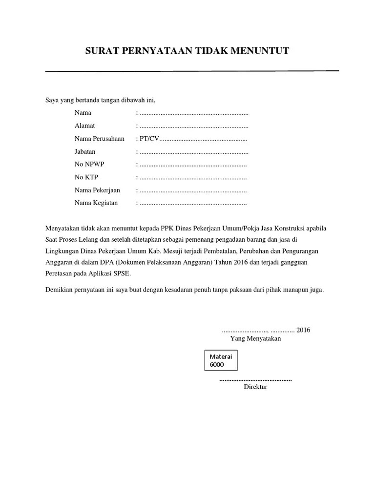 Contoh Surat Pernyataan Tidak Menuntut Perusahaan - Jenis surat pernyataan yang sangat beragam mungkin membuat anda merasa kebingungan ketika harus membuat salah satu jenis surat. Jika melanggar sudah tentu akan menerima konsekuensi atas kesalahan yang sudah diperbuat bahkan juga membuat pernyataan kesalahan. Contoh surat pernyataan tidak menuntut adalah gambar contoh surat berdefinisi tinggi dan memiliki ukuran 1700x2200. Untuk penerima dengan adanya surat pernyataan penerima memiliki alasan atau alat bukti untuk menuntut pertanggungjawaban pihak yang menulis surat pernyataan tersebut jika ia mendapati apa yang ada di dalammnya tidak sesuai dengan keinginannya. Contoh surat pernyataan tidak menuntut. Untuk lebih jelas sebaiknya perhatikan contoh surat pernyataan dari beberapa fungsi. Contoh Surat Pernyataan Tidak Menuntut Perusahaan Pernyataan yang diberikan secara lisan sering kali sulit untuk diingat dengan secara rinci. Berikut beberapa manfaat surat pernyataan bagi masing masing pihak.